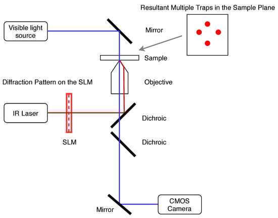 It can be seen that the ability to create multiple optical traps is extremely useful in microrobotics. This is particularly true in the case of free-floating micromachines with moving parts [,], when the overall position of the microrobot must be controlled as well as its relative motion. Using several different laser beams would be both expensive and greatly increase the space required for an optical trapping set-up. Luckily, several solutions have been developed for the creation of multiple traps from a single focused laser beam. These can be divided into space-sharing and time-sharing set-ups, with holographic optical tweezers [] being an example of the first type and fast-switching acousto-optic deflectors [] being an example of the latter. Holographic optical tweezers (HOT) utilise spatial light modulators (SLM) to split an incoming beam into several different beams, which are then directed through the microscope aperture, as shown in Figure 6. This technique is particularly flexible in terms of the number of traps that can be created, and the range of movement that is allowed, as it relies only on the pattern imposed on the SLM. Work regarding the calibration of HOT using the power spectrum analysis has also revealed that trap stiffness does not vary significantly during trap movement, and that trap placement is controllable with single-nanometer resolution []. These capabilities identify HOT as a useful and versatile tool for force application and measurement in biophysical experiments. However, the real-time use of the technique is limited, due to the calculations required to determine the required pattern of orientations of liquid crystalline pixels across the device in order to create the desired trap positions. Several different methods for performing this calculation are presented in the literature, including the high-performance yet low-speed Gerchberg-Saxton algorithm [] and the low-precision yet high-speed direct superposition method []. Therefore, when calculating holograms for optical tweezers or other laser-based applications, a trade-off must be made in terms of either speed or accuracy [], with attempts made to adapt these existing algorithms to produce high speed, high performance alternatives [,].