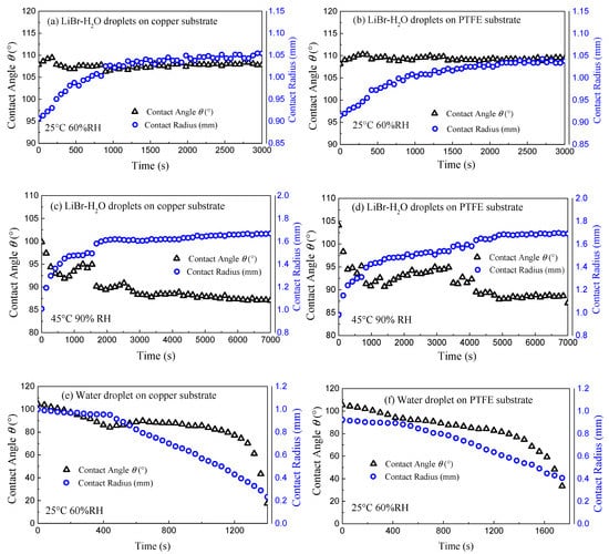 Figure 2 indicates the representative varying curves of contact angle θ and contact radius r of LiBr-H2O droplets for 25 °C—60% RH and 45 °C—90% RH conditions, as well as the contrast pure water droplets for 25 °C—60% RH conditions on copper and PTFE substrates.