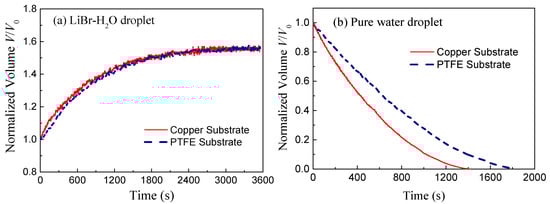 Figure 3 shows the variation of normalized volume V/V0 of LiBr-H2O droplets and pure water droplets on copper and PTFE substrates taking 25 °C and 60% RH conditions as a representative example. At this ambient condition, the rate of vapor absorption is moderate while the vapor absorption phenomenon is apparent and the equilibrium state is easily reached. Due to vapor absorption, the volume of LiBr-H2O droplets increases rapidly at first and then slows down as the droplet gets saturated with water. Comparing the increasing trend of the two curves, it can be seen that the rate of vapor absorption of droplets on copper substrates slightly outweighs that of droplets on PTFE substrates at the initial period (0–600s), while at the final equilibrium stage, the droplet volume attained in the two cases is the same. Differently, for pure water droplets, the evaporation rate is found to be greatly affected by the substrate conductivity. As shown in Figure 3b, water droplets on copper substrates exhibit an apparently higher evaporation rate and shorter lifetime than those on PTFE substrates, which corresponds with the results in previous studies [10,11].