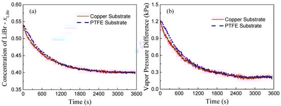 In the case of 54 wt. % LiBr-H2O droplets, the vapor absorption will induce the variation of both temperature and concentration as indicated in Figure 7. By dividing the vapor absorption process into an isoconcentration process (where the temperature changes alone) and an isothermal process (where the solute concentration changes alone), it can be seen that the variation of water vapor pressure induced purely by temperature change is about 1.3 kPa, while the variation induced by concentration change is about 6.5 kPa. This demonstrates that the vapor diffusion in the gas phase and the rate of vapor absorption is mainly controlled by the concentration variations of LiBr–H2O droplets instead of the interfacial temperature. Since the substrate conductivity only affects the transient heat transfer and the evolution of interfacial temperature, its effect on the rate of vapor absorption is therefore not apparent as evidenced by our experiments. This reminds us that, in the mathematical modeling of vapor absorption, more efforts must be made into the accurate description of the dominating mass transfer process where the concentration distribution is of high importance, while the thermal transport process can be properly simplified in order to improve the simulation efficiency, i.e., computing time.
