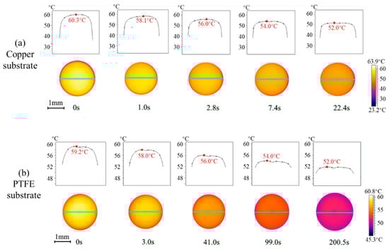 Spatiotemporal evolution of interfacial temperature of LiBr-H2O droplets on (a) copper and (b) PTFE substrates coated with FEP.