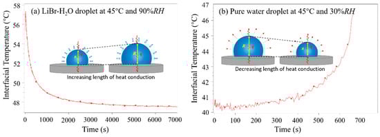 Figure 6 indicates the representative varying curves of average interfacial temperature of LiBr-H2O droplets (Figure 6a) and that of pure water droplets (Figure 6b) on a PTFE substrate. For water droplets (Figure 6b), the interfacial temperature is low at the initial period as a result of evaporative cooling, and then increases due to heat supply from the substrate. Moreover, the increase of interfacial temperature speeds up towards the end of the droplet lifetime. This is because, as water evaporates, the volume of water droplet shrinks. In this case, the length for heat conduction from the liquid–solid interface to the liquid–air interface decreases and the heat capacity of the liquid droplet become smaller; therefore, the droplet surface warms up quickly. By comparison, for LiBr-H2O droplets (Figure 6a), the decrease of interfacial temperature slows down along with time. This is because, as vapor absorption goes on, the volume expansion of the LiBr-H2O droplet causes an increase in both the characteristic length for heat conduction and the heat capacity of the droplet. In this case, the thermal resistance for heat conduction increases, and the temperature decrease at the droplet surface slows down.