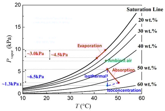 where Pvapor,ambient is the partial vapor pressure of ambient air, Pvapor,surface is the vapor pressure at the liquid–air interface, and Psat is the saturation vapor pressure of pure water at shifted temperature, Θ. Θ is function of the mole fraction, xmole, and temperature, T, of the LiBr-H2O solution, and can be calculated as Equation (2):