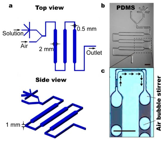 Schematic drawing (a) and optical image (b) of the fluidic mixer. (c) Air bubbles generated on-chip and transport within fluidic channels. Scale bars denote 4 mm in all figures.