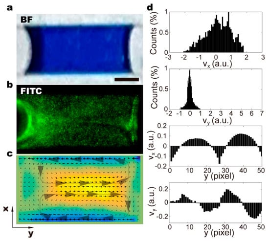 It is demonstrated that with no air input, solutes of the five inputs remain separated near the end of the fluidic chip (Figure 2a). The gradual blurry in the boundary from positions (1) to (3) can only be attributed to thermal dynamic diffusion and minor turbulent flow at the corner section. At high input air pressure, laminar streams of five solutions were frequently separated by air input and form individual droplets (Figure 2b). The mixing efficiency is satisfactory. Different coloring at the top and bottom parts of the droplet is still visible at position (1), which is ≈1 cm away from the Y-junction and position (2) (≈3 cm to the Y-junction). Apparently, it requires a certain distance for the droplet to move, which ensures thorough mixing. The flow profile is traced using fluorescent particles of ≈1 μm in diameter. We observe that the droplets moving in the straight parts of the fluidic channels generate a steady recirculating flow (Figure 3a–c) []. Even though the velocity perpendicular to fluidic channel can be as high as two times the driving flow rate, the direction distribution is symmetric, suggesting circulating flow within only half of the droplet (Figure 3d and Video S1). The flow rate along the channel direction is mostly slower than the driving flow rate. As reported before, the 3D flow allows mixing within half of the droplet, and thus the mass transfer in the transversal direction still relies on molecular diffusion and takes time [,]. The changed dimension of constrictions along the fluidic channel induces chaotic advection in individual droplets by dynamically changing the shape of the droplet and introducing asymmetry into the recirculating flow system []. As the convection flow rate is determined by droplet moving speed, the mixing efficiency depends strongly on the driving flow rate and channel geometry.