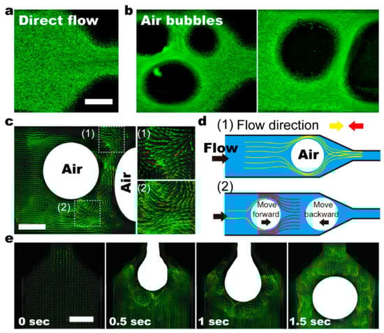 Notably, these small bubbles move with the bulk fluid (Video S2). When passing through constrictions, strong shear generated at the sides further facilitates mixing, preventing the fluidic channels from being fully blocked. Additionally, bubbles regain their round-shaped conformation when being “pushed” out (Figure 4e). The sudden changes in bubble shape and confinement space create chaotic advection, and facilitate mixing.