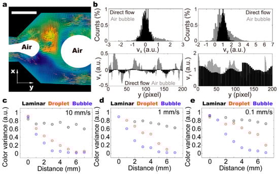 (a) Turbulent flow generated with the presence of air bubbles on-chip. (b) Flow distribution within the channels demonstrates that air bubbles as stirrers substantially enhance the flow rate in cross-sectional direction of the channel, which allows for fast mixing. The flow velocity is normalized to the driving flow rate to illustrate the mixing efficiency. (c–e) Color variances are measured in the cross-section at different positions along the fluidic channel (i.e., distance from the Y-junction). To obtain the color variances, light intensities of selected area along the fluidic channel are measured in the red channel of the RGB picture, and calculated to get the standard deviation (Figure S3). Three different driving flow rates (i.e., 10, 1, and 0.1 mm/s) are analyzed. The scale bar denotes 500 μm.