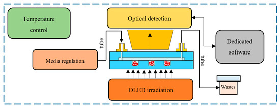 As the source of cells irradiation, for the first time, the OLED display (model: microOLED-160G2, 4D Systems, Minchinbury, Australia) with the programmatically changeable spectrum was applied. Utilizing the chosen light source, a precise and selective illumination of the lab-chip could be achieved, maintaining uniform optical power in the area of interest. Dedicated software also allowed for the luminance regulation in the range of 70–100 Cd/m2.