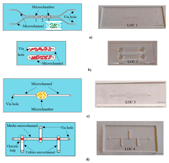 A family of all-glass lab-chips dedicated to cell culturing of various biological objects: (a) freshwater micro-organisms—Euglena gracilis (volume of the single microchamber: ~1 μL, surface area: 4 × 2.5 mm2), (b) mushrooms—Cladosporium macrocarpum (volume of the microchannel: ~23.5 μL, surface area: 16.8 × 3.5 mm2), (c) human cancer cells SKOV-3 (volume of the microchamber: ~8.5 μL, surface area: 9.5 × 6 mm2), (d) porcine oocytes (volume of the culture microchannel: ~0.6 μL, surface area: 7 × 0.5 mm2). Scale bar—1 cm.