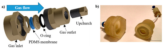 As the culturing on the platform was dedicated to various cells, the platform was equipped with the elements ensuring the delivery of nourishment in both gaseous or liquid form. In the case of the gaseous media, a solution of 3D membrane-based gas regulator was used (Figure 3) [30], providing precise and repeatable flow in the range of 0.1–50 μL/min. With regard to liquid media supply, a commercial solution of MEMS micropump (model: mp6, Bartels Mikrotechnik, Dortmund, Germany) was applied. Standard microfluidic connectors (Nanoport Assembly, Idex H&S, Oak Harbor, WA, USA) were used at the LOC interface to enable repeatable dosing of the culturing media through the ferrule of 1/16′’ diameter (PFA tubing, Idex H&S, Oak Harbor, WA, USA).