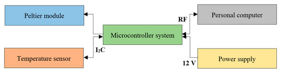 The operation of the module refers to the initialization of programmable PID (proportional–integral–derivative) algorithm. Digital temperature sensor (model: MCP9800, Microchip Technology, Chandler, AZ, USA) communicates with the microcontroller (MKE02Z64VLD2, NXP Semiconductors, Eindhoven, The Netherlands), which, based on its indication, steers the Peltier module (model: TEC1-07108 Stonecold, Transfer Multisort Elektronik TME, Łódź, Poland) in a closed feedback loop to maintain the desired temperature on-chip. The temperature module communicates with the PC wirelessly by the RF device (model: nRF24L01+, Botland, Gola, Poland), Figure 4. Observable temperature fluctuations do not exceed ±0.25 °C here.