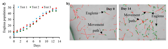 In view of the photosynthesis-based capabilities of E. gracilis, a 14-day culture of this micro-object was achieved by the constant delivery of CO2 (flow rate: 0.3 μL/min) to the chip microchambers (Figure 5). The exponential development of these creatures, reaching a plateau at the 12th day of the test, was consistent with the literature data [35,36]. In addition, appropriate, straightforward swimming character of E. gracilis during all the culturing time was observed (Figure 5).