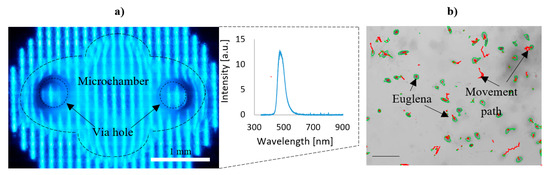 Study on E. gracilis phototaxis on the LOC platform: (a) view of the OLED illuminated microchamber with spectrum characteristics (blue color, 470 nm), (b) microscopic image of E. gracilis response to this illumination—visible rotational movements detected by the software. Luminance was set to 100 Cd/m2 for each test. Scale bar—100 μm.