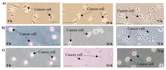 Microscope images of cancer cell cultures developed: (a) on a Petri dish in the incubator; (b) in the lab-on-chip device placed in the incubator (no medium flow), (c) utilizing the LOC platform (constant medium flow)—visible change in cells morphology. Scale bar—20 μm.