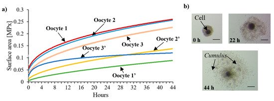 As shown in the graph (Figure 8), a notable growth of oocytes (considering especially the expansion of cumulus cells) could be noticed, being a qualitative evaluation of the well-fitted culturing conditions on the platform. Each of the matured oocyte increased in size by at least 100%, which was a similar result to the reference incubator cultures. After circa 34 h of IVM, oocytes’ expansion reached the plateau level, as indicated in the work of [39].