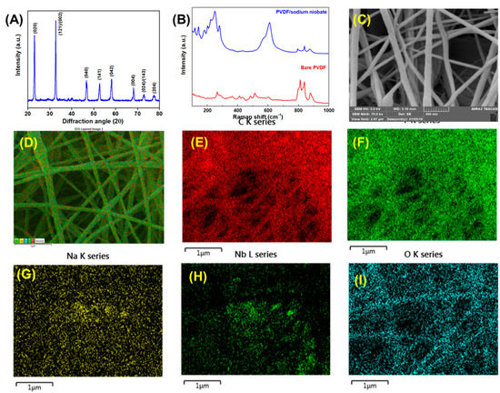 The physicochemical characterization of the sodium niobate and PVDF/sodium niobate nanofibers are provided in Figure 1. Figure 1A shows the distinct diffraction pattern of the crystalline phase of sodium niobate well matched with the JCPDS no.: 82-0606 [22]. The peak obtained at the diffraction angle 22.94°, 32.75°, 46.8°, 52.67°, 58.11°, 68.2°, 72.85°, and 77.41° corresponds to the (020), (121)/(002), (040), (141), (042), (004), (024)/(143), and (204) planes of the sodium niobate with the space group of P21ma. Figure 1B and Figure S1 shows the Raman spectrum of the electrospun PVDF, PVDF/sodium niobate nanofibrous mat, and as prepared sodium niobate. The electrospun PVDF mat indicates the presence of significant bands over 790 to 900 cm−1 [27] whereas the PVDF/sodium niobate shows the major vibrational bands at 115, 140, 175, 198, 224, 246, 276, 428, 571, 612, and 870 cm−1 all correspond to the ferroelectric phase of sodium niobite [28]. The presence of a Raman band observed at 615 cm−1 (ν1) accompanied by a shoulder at around 571 cm−1 (ν2) confirms the orthorhombic perovskite structure of the sodium niobate in the PVDF matrix [22]. Furthermore, the vibration bands due to PVDF are diminished in the composite since the vibration bands that have arisen from crystalline sodium niobate overwhelm the weak vibrations bands of PVDF [29]. The surface morphology and the elemental mapping analysis of the bare sodium niobate and the electrospun PVDF/sodium niobate are shown in Figure S2 and Figure 1B. Figure 1C shows the FE-SEM micrograph of electrospun PVDF/sodium niobate which clearly depicts the formation of nanofibers with an average diameter ranging from 100–200 nm. Furthermore, the elemental mapping of the electrospun PVDF/sodium niobate nanofibrous mat (Figure 1D–I) shows the uniform distribution of Na, Nb, O, C, and F in the prepared nanofibrous mat.
