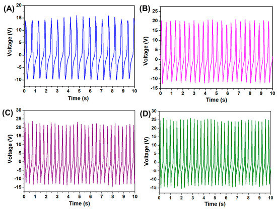 The piezoelectric characterization of the bare PVDF and electrospun PVDF/sodium niobate nanofibrous mat was investigated by fabricating the nanogenerator device [30]. Figure S3 shows the comparative voltage output of the PVDF and electrospun PVDF/sodium niobate nanofibrous mat obtained under an applied compressive force of 10 N. The incorporation of sodium niobate in the PVDF matrix results in an output voltage of 25 V, which is higher compared to bare PVDF, thus indicating the enhanced piezoelectric response. The improved energy harvesting properties of the PVDF/sodium niobate is due to the enhancement in dipole alignments of PVDF and the synergetic effect of the piezoelectric ceramics [13,31]. The voltage output of the fabricated device under various compressive forces (10 to 40 N) is shown in Figure 2A–D. The output peak to peak voltage of the electrospun PVDF/sodium niobate nanofibrous mat is about 25 V under an applied compressive force of 10 N. With the increase in the applied compressive force, the peak to peak voltage of about 40 V is obtained for the fabricated energy harvester. The increased voltage output from 25 to 40 V with an increase in the applied compressive force of 40 N is due to the enhancement in the piezo-response of the PVDF/sodium niobate mat [30,32]. The comparative voltage output of the various piezoelectric nanogenerator is compared with the current work and tabulated in Table 1.