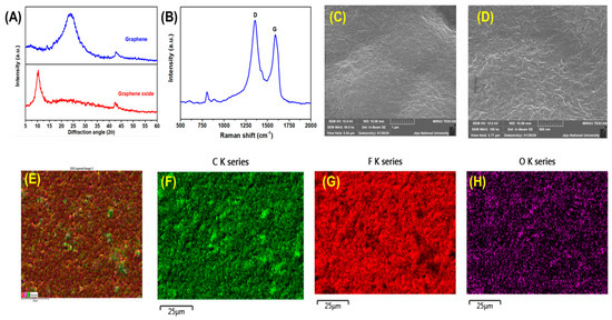 In the view of energy storage application, PVDF/reduced graphene oxide has been chosen as the electrode material. Figure 3 shows the physico-chemical characterization of the prepared graphene and PVDF/reduced graphene oxide composite film. Figure 3A shows the X-ray diffraction pattern for the prepared graphene oxide and reduced graphene oxide. The diffraction pattern of the graphene oxide shows a sharp predominant peak at 10.4° correspond to the (001) plane of the carbon present in the graphene oxide whereas, after the sonochemical process, the graphene oxide was reduced entirely to graphene nanosheets with a sharp and broad peak at 24.3° assigned to the (002) plane which suggest the increase in the graphitic nature of the material [40]. Figure 3B shows the Raman bands of the PVDF/reduced graphene oxide composite film exhibits the characteristic Raman vibrational bands of graphene. The band at 1357 and 1599 cm−1 corresponds to the D and G band of the graphene in the PVDF matrix [41], and the other bands in the region of 700 to 1000 cm−1 corresponds to the characteristic band of PVDF [42]. The surface morphology and the elemental mapping analysis of PVDF/reduced graphene oxide composite film are shown in Figure 3C–G. Figure S4A,B show the FE-SEM micrograph of reduced graphene oxide resembling the sheet like morphology. Figure S4C–F shows the elemental mapping analysis of the reduced graphene oxide confirms the presence of carbon and oxygen uniformly distributed in the sheets. The energy-dispersive X-ray spectroscopy (EDS) spectrum reveals the reduced graphene oxide contains C:O in the ratio of 84.2:15.8 which is in agreement with the previous reports [43]. The FESEM micrograph shown in Figure 3C,D shows the low and high-resolution micrograph of the PVDF/reduced graphene oxide composite film with the uniform distribution of the reduced graphene oxide in the PVDF composite [44]. Besides, the elemental mapping analysis provided in Figure 3E–H also confirms the presence of carbon, oxygen, fluorine in the PVDF/reduced graphene oxide composite film.