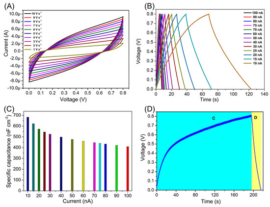 Electrochemical characterization of the PVDF/reduced graphene oxide symmetric supercapacitor (SSC). (A) Cyclic voltammetry profiles of PVDF/reduced graphene oxide SSC recorded using various scan rates (1–10 V s−1). (B) Galvanostatic charge-discharge profiles of the PVDF/reduced graphene oxide SSC recorded using different current (10 to 100 nA). (C) Effect of current on the specific capacitance of the PVDF/reduced graphene oxide SSC. (D) The charging profile of the PVDF/reduced graphene oxide SSC with the applied compressive force of 40 N applied to the PVDF/sodium niobate nanogenerator device.