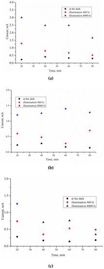 The J(t) curve measured under 460 lx illumination has a typical shape for the potentiostatic regime. The short-circuit current occurring under 460 lx illumination first rises sharply and then decreases significantly over 180–360 s. After 360 s, the current density is reduced from the maximum value to a stable value.