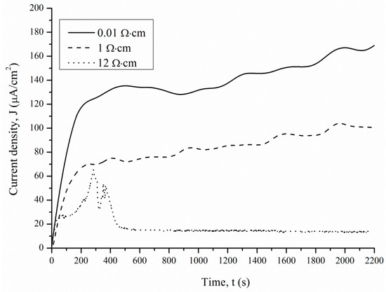 The slope of the I segment (∂J/∂t) characterizes the porous layer nucleation rate, which will be higher for ρ = 0.01 Ω·cm in the case of different values of ρ. This result is consistent with the experimental data in Figure 6. The higher the speed of the Vsurface, the greater the area of silicon dissolution, so a larger number of charge carriers will inject into silicon and reach the non-working side of the plate.