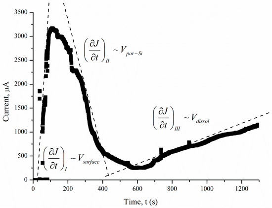 J(t) reflects a change in the area (S) of the electrochemical reaction front. Changes in J with time (Figure 7) are related to the evolution of the Si morphology during pore nucleation. Pore formation takes place after the immersion of silicon into the solution containing HF and H2O2. The pore area depends on the duration of treatment. The increase in the specific surface area leads to growth of the current density—the first region. The current growth will continue until a porous layer of critical thickness is formed on the Si surface. In this case, access of the solution to the surface of monocrystalline silicon becomes limited. The transport of holes through porous silicon is difficult due to the high resistivity of the por-Si.