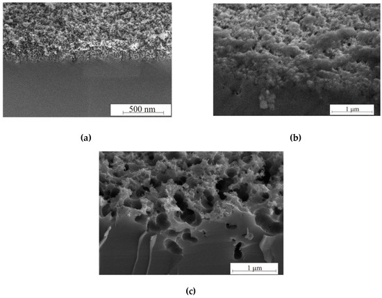 Wafers of p-Si (100) with = 0.01, 1, and 12 Ω·cm were used as the substrate. The silicon wafers were treated with piranha etch (a mixture of H2SO4 (98 wt.%) and H2O2 (30 wt.%) (1:2 by volume)) for 600 s at 130 °C. Then, the wafers were rinsed with deionized water and dried in an isopropyl alcohol vapor flow. The organic solvent vapor reduces the surface tension of the solution, and, due to this, water and small particles are removed from the surface of the substrate.