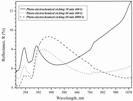 As can be seen from the reflectance spectra, even after 600 s of porous silicon formation, the optical reflectance at the air–silicon interface is significantly reduced as the porous layer thickness increases. The resistivity influences the porous silicon thickness (Figure 1). Thus, the sample formed on p-Si with ρ = 0.01 Ω·cm under 8000 lx illumination has a minimum reflectance, because the pore density has maximum values in this case. Porous silicon thickness depends on treatment duration and illumination.