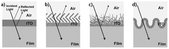 Among various TCO materials indium tin oxide (ITO) has been extensively used in a wide range of applications due to its high transmittance and low sheet resistance [8,9,10]. Figure 1a shows a schematic diagram of the conventional ITO film structure having three interfaces (air-ITO, ITO-substrate, and substrate-air). Reflection occurs at the interfaces between two media having a different refractive index and this causes decreased transmittance and contrast, resulting in performance degradation of optoelectronic devices based on ITO films.