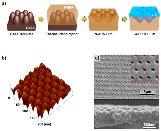 Figure 2a shows the fabrication process of the CCTI ITO film. In order to produce the CCRI ITO film, a GaAs template with paraboloidal nipples of subwavelength size in a hexagonal array was initially prepared, as shown in Figure 2b [20]. Using a thermal nanoimprint process, tapered pores of approximately 200 nm depth with a 290 nm lattice period were fabricated on the PMMA film surface [19]. Afterward, ITO was coated on the surface of an N-ARS film via sputtering. Thereafter, no additional heat treatment was performed due to the low thermal properties of the PMMA film (not only CCRI but all ITO films on PMMA in this study). Figure 2c shows that while ITO somewhat depended on the position of the nipples, ITO was coated continuously on the surface of the N-ARS film. It is also noted that the thickness was smaller than 50 nm on the flat PMMA surface without ARS coated simultaneously, because the N-ARS increases the actual surface area by more than 1.8 times.