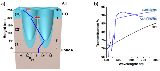 The reflection at the interfaces in the CCRI ITO film is governed by the refractive index profile along the film thickness direction, from the top air to the bottom substrate. The effective refractive index profiles of the corresponding structure to the CCRI ITO film are shown in Figure 3a. Assuming that the ARS is the subwavelength structure, that is, assuming the lattice period (d) of ARS is sufficiently smaller than the wavelength of light in the medium (d < λ/n; at a low visible wavelength range, d > λ/n), according to the Bruggeman effective medium model, the effective refractive index (neff) of a plane of any specific height (z) in the CCRI ITO film is given as follows [22,23]