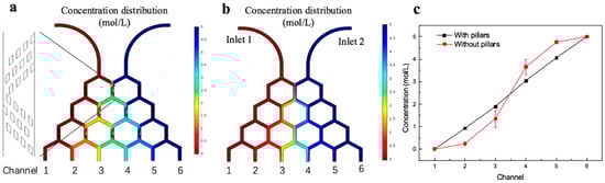 In order to obtain sufficient mixing of two solutions, the lengths of vertical channels should be long enough. The Christmas tree structure has been widely used as one of the controllable and effective gradient generators. However, zig-zag mixers inside the Christmas tree structure may result in high hydraulic resistance and big area occupation [35]. To solve this issue, passive mixers and passive diffusion are used in microfluidic devices to increase mixing effects [36,37]. In this experiment, we fabricated some parallelogram micropillar arrays in the vertical channels. Molecular motion was promoted due to obstacles in flow direction, so that mixing effects were facilitated. The surface concentration field in stationary fluid static of the two structures, with and without micropillar arrays, were analyzed by COMSOL Multiphysics (5.2, COMSOL Inc, Middlesex County, MA, USA) respectively. The inlet 1 is injected by water and the inlet 2 is injected by 5 mol/L glucose solution. Simulation result shows the mixture of each outlet is more uniform in the generator with micropillar arrays (Figure 2a). Nevertheless, the diffusion in the generator without micropillar arrays was not sufficient because of short channels. The concentration encounter was used to describe concentration range of each outlet, which is shown in Figures S2 and S3. In addition, we calculated the average value of each outlet and contrasted both structures of the concentration distribution in outlet. The generator with micropillar arrays showed a good linear relationship between the channels and the concentration (Figure 2c), however concentration gradient was not generated linearly in the generator without micropillar arrays. At the same time, the error bars in Figure 2c shows the worse distribution at the outlet 3 and outlet 4, which is in consistent with the phenomenon in Figure 2b. The boundary of two fluids at outlet 3 and outlet 4 could be clearly distinguished.