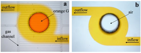 The chambers are used to trap and culture bacteria. For the purpose of protecting bacteria from shear force, the larger and deeper chambers are better [39,40]. However, it is difficult to load the bacteria into chambers. The surface tension of liquid is hard to break due to laminar flow, therefore, the air in chamber cannot be pumped off by sufficient stress, resulting in the failure of loading the sample into chambers. One gas channel array consisting of 25 microchannels with 15 μm in width and 5 μm in depth was designed to exhaust the air in culture chamber. Figure 4a shows that the liquid can be flowed into the chamber with gas channel, while it failed to load into the chamber without gas channel, shown in Figure 4b. The main gas channel linking to the air is closed after sample loading, and there is no orange G solution in it (Figure 4a).