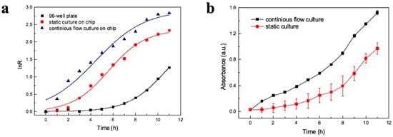The growth of E.coli in batch culture and continuous flow culture were observed on chip for 11 h. In static culture, the M9 medium was stopped to flow after loading the bacteria into the chamber. The result is shown in Figure 5b. The μmax of static culture on chip is 0.343, which is lower than continuous flow culture on chip. What need to be noted is that during the period of bacterial growth in batch culture, there were several bubbles forming in the culture chamber. It may be caused by the gas produced in the process of metabolism of bacterial growth. Micro-size bubbles were formed in side wall of culture chamber during the process of bacterial growth in batch culture, which leads to error bars larger than in continuous flow (Figure 5b). In comparison, no bubbles were observed during bacterial growth on chip in continuous flow culture for up to 11 h. This implies that continuous flow is capable of taking away small amount of gas. In addition, the growth rate of bacteria in continuous flow is faster than without continuous flow and 96-well plate. It is possible that bacteria accumulate in the area with abundant nutrient in the effect of chemotaxis, and they are more likely to acclimatize by communicating with each other. Therefore, continuous flow can promote bacteria to acclimatize the new environment and grow.