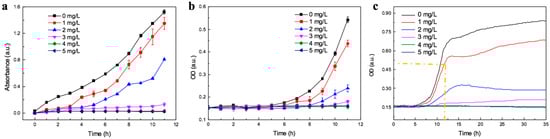 Inhibition test of E. coli by amoxicillin: (a) The growth curve of bacteria on chip exposed to different concentrations of amoxicillin for 11 h. (b) Bacterial growth in 96-well plate exposed to different concentrations of amoxicillin for first 11 h. (c) Bacterial growth in 96-well plate for 35 h. Bacterial growth for first 11 h is marked by yellow dash line.