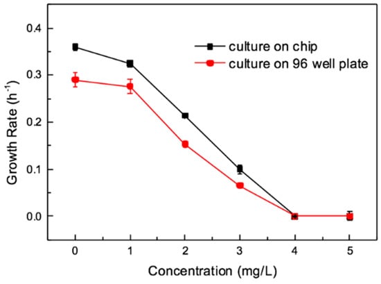 Figure 7 is the curve of concentration and growth rates for on chip and well plate. The max growth rates were obtained from the fitting curves, which were shown in Figure S7b (the parameters in Table S2), and biological parameters are also shown in Supplementary Information. It shows that at 3 mg/L, the bacterial growth was obviously inhibited in both chip and well plate tests, which could also be seen from growth curve. The growth rate of bacteria culture on well plate and on chip approaches to zero at antibiotic concentration above 4 mg/L. Therefore, the MIC was 4 mg/L. This result was in the range of 2–8 mg/L reported by the Clinical and Laboratory Standard Institute [44].