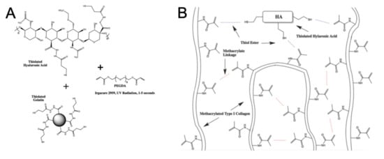 Hydrogel compositions. (A) The HyStem hydrogel system, comprised of thiolated hyaluronic acid, thiolated gelatin, and a polyethylene glycol diacrylate (PEGDA) crosslinker. (B) Our collagen–hyaluronic acid (HA) hydrogel formulation, comprised of methacrylated collagen and thiolated hyaluronic acid.