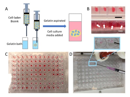 Hydrogel–cell organoids were bioprinted using custom-written gcode to drive the bioprinters (Supplementary File S1). The printhead needle traveled into the gelatin bath of each well and deposited approximately 20 μL of cell-laden bioink before moving to another well and repeating. A UV lamp (365 nm, 18 W/cm2, Dymax BlueWave 75, Dymax Corporation, Torrington, CT, USA) was then employed to irradiate each well for about 1 s each, initiating the crosslinking reaction between remaining thiol groups and methacrylate groups and between methacrylates groups themselves. Following crosslinking, well plates were transferred to 37 °C briefly to decrease the viscosity of the gelatin, after which it was aspirated from the wells and replaced with fresh cell culture media.