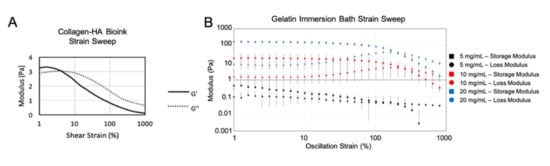 Rheological assessment of collagen–HA bioink versus gelatin bath solution. Storage and loss moduli data resulting from strain sweep tests from 1% to 1000% shear strain (γ) for (A) the collagen–HA bioink and (B) gelatin solutions (5, 10, and 20 mg/mL).