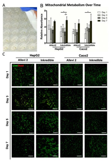Metabolic activity and viability over time of organoids formed using HepG2 and Caco2 cells. (A) A representative image of more fine-tuned organoids (supplemented with gelatin) for visualization, in 96-well plates with greater consistency of geometry and size. (B) Quantification of mitochondrial metabolism using (3-(4,5-dimethylthiazol-2-yl)-5-(3-carboxymethoxyphenyl)-2-(4-sulfophenyl)-2H-tetrazolium) (MTS) assays. The higher the metabolic activity, the higher the quantity of cells. Significance: * p < 0.05. (C) Live/dead staining of organoids over time, showing a high prevalence of viable cells. Green—calcein AM-stained viable cells; red—ethidium homodimer-1-stained dead cells. Scale bar = 150 μm.