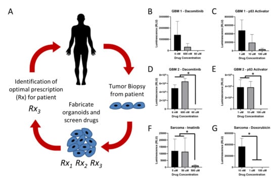 Employing bioprinted patient-derived tumor organoids in a clinical precision medicine setting. (A) Tumor tissue is removed from a patient as a biopsy or during surgery. The biospecimen is then dissociated and biofabricated into sets of small organoids or tumor constructs using hydrogel bioinks, after which empirical drug response data can be generated during chemotherapy screening studies. Resulting drug response data can be used to help predict which drugs might be most effective for that specific patient. (B–G) ATP quantification representing cell viability following chemotherapy screens in immersion bioprinted glioblastoma and sarcoma patient-derived tumor organoids. (B,C) Glioblastoma (GBM) 1 biospecimen organoids treated with dacomitinib and a p53 pathway activator. (D,E) GBM 2 biospecimen organoids treated with dacomitinib and a p53 pathway activator. (F,G) Sarcoma biospecimen organoids treated with imatinib and doxorubicin. Statistical significance: * p < 0.05.