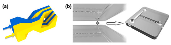 (a) Schematic view of working mechanism of the micromixer. The two microfluidic streams sent into the mixing unit are divided into four sub-streams alternatively spaced with each other at the middle of the unit and further divided into eight streams at the exit; (b) Schematic of the 3D micromixer constructed by bonding two substrates with microfluidic channels fabricated by femtosecond laser micromachining on the top surfaces.