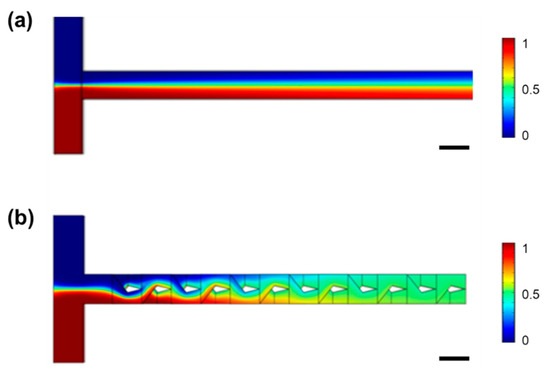 Numerical simulations of mixing performances at a flow rate of 2 mL/min in (a) a T-shape straight microchannel with a rectangular cross section and (b) a 3D micromixer consisting of six mixing units. The straight microchannel and the 3D micromixer have the same total length and the same cross section area. Scale bar in (a,b): 0.5 mm.