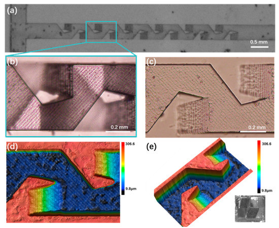 The top view micrograph of the fabricated 3D microfluidic mixer is shown in Figure 4a. One can see that it contains six mixing units. The sharpness of the edges and corners in the fabricated structure provide the evidence of the high machining quality of the femtosecond laser. Figure 4b presents the detailed top view image of one of the mixing units. Figure 4c presents the top view image of half of the micromixer before bonding. Figure 4d,e exhibit the 3D profiles of the structure in Figure 4c from different angles of view, showing a maximum depth of ~270 µm in the fabricated microchannel. The optical micrograph of the cross section was illustrated in the inset of Figure 4e. The cross section shows a square profile with a side length of 0.5 mm. Because of the relatively large height and width of the micromixer, the production throughput can be efficiently promoted, which is highly in demand by industrial application. It should be noted that the measured roughness of the micromixer’s inner surface in the region of 200 µm × 200 µm is 872 nm, which is orders of magnitude smaller when compared to the size of the micromixer. As a consequence, the impact of the surface roughness to the mixing process can be ignored.