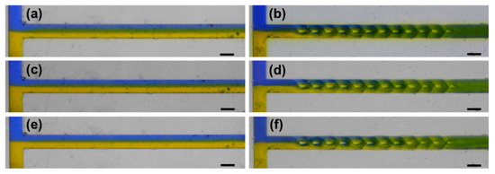 Microscope images of the mixing behaviors of the blue and yellow ink solutions in straight channel at a flow rate of (a) 1 mL/min, (c) 2 mL/min and (e) 6 mL/min, and in fabricated 3D micromixer at a flow rate of (b) 1 mL/min, (d) 2 mL/min and (f) 6 mL/min. Scale bar in (a–f): 0.5 mm.