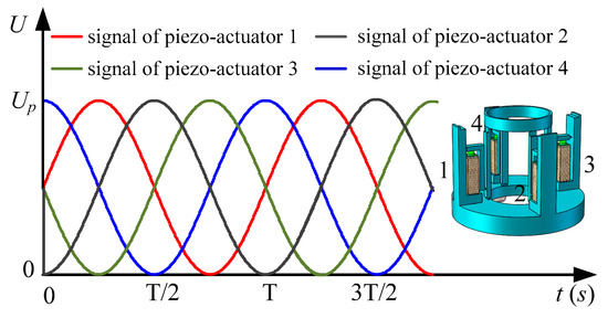 where U1, U2, U3, U4 are the voltage that is applied to the piezoelectric actuators; Up is the peak value of the voltage; f is the driving frequency.