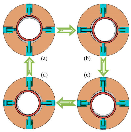 Driven by four signals, the harmonic wave is generated on the top surface of the harmonic generator, which is shown in Figure 3. Here, branch Figure 3a–d represent the initial position (or 360° position), 90° position, 180° position and 270° position of harmonic wave, respectively. However, when the order of input signals for piezoelectric actuators changes in Equation (2), the rotational motion turns in the opposite direction.