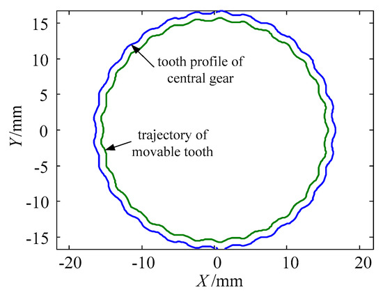 The harmonic forces push the movable teeth to mesh with the tooth profile of the central gear, and the motion of movable teeth drive the tooth carrier to generate a small angle. The equations and diagram of the tooth profile of central gear and trajectory of movable tooth [28] are presented in Equations (3) and (4) and Figure 4: