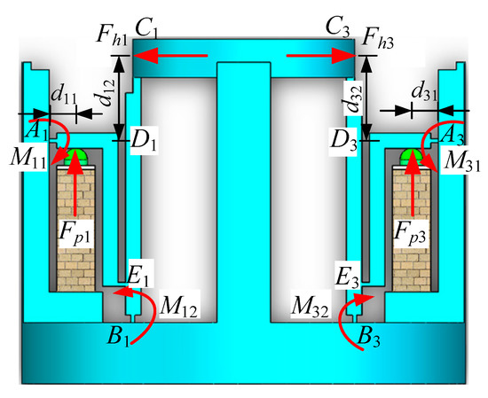 Figure 5 shows the forces of the displacement amplification mechanism, where Fpi is the output force of the piezoelectric actuators, Fhi is the force that applied to the wave generator, Mi1 and Mi2 are torsional moment of the flexible hinge, di1 and di2 are length dimension, and i = 1, 2, 3, 4. According to theoretical mechanics, establishing the force balance equation as follows: