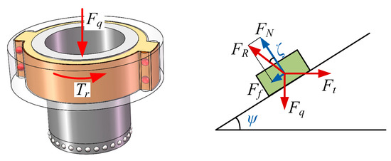 When the piezoelectric focusing mechanism works, the output torque of the tooth carrier is transferred to the screw drive mechanism to realize the linear motion of the lens. Figure 7 shows the force diagram of the screw drive mechanism, where Fq and Ft are axial pushing force and horizontal pushing force, supporting force FN and frictional force Ff constitute the opposite force FR, Ψ and ζ are the helix angle and frictional angle of the screw drive.